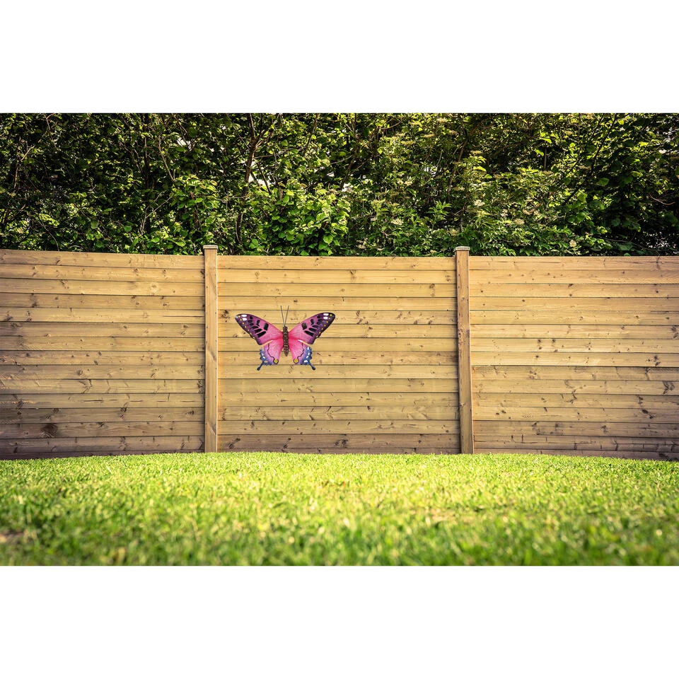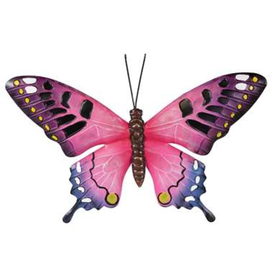Tuindecoratie vlinder van metaal roze 37 cm. Deze metalen wanddecoratie vlinder heeft een formaat van ca. 37 x 27 cm. Materiaal: metaal. U kunt de vlinder bevestigen aan de wand/muur of schutting, bevestigingsmateriaal niet inbegrepen.