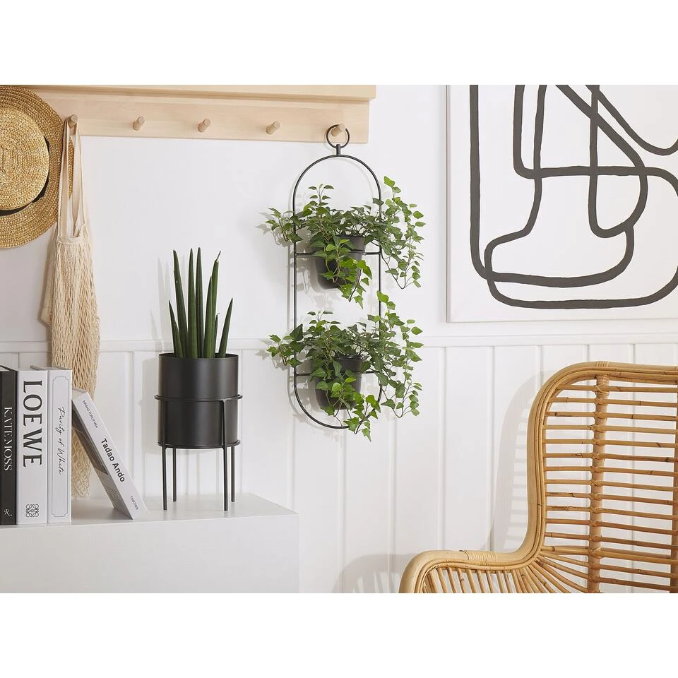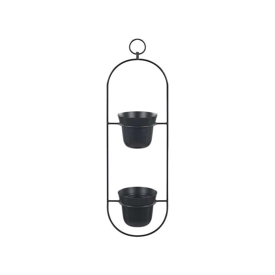 Hangende plantenpot met 2 niveaus. Deze hangende plantenbak is een geweldige manier om een bloemig accent aan je huis of balkon te geven. Het minimalistische ontwerp met gebogen silhouet past goed bij elke interieurstijl, waardoor het stuk een geweldige wanddecoratie is. De bloempotten zijn gemaakt van stevig metaal, de zwarte tweelaags constructie is zeer gemakkelijk te onderhouden en zal je jarenlang van dienst zijn.