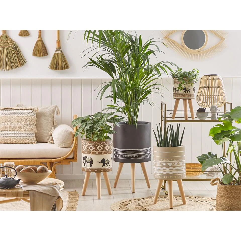 Donkergrijze bloembak op houten pootjes. Een moderne bloembak dat perfect zal werken in elk industrieel en minimalistisch interieur. Dankzij de combinatie van een diepe, grijze pot en een hoge houten standaard, kun je eenvoudig je favoriete bloemen laten zien. De set wordt geleverd met een plastic inzetstuk dat de pot beschermt tegen vocht en aarde en het verplanten van planten vergemakkelijkt.