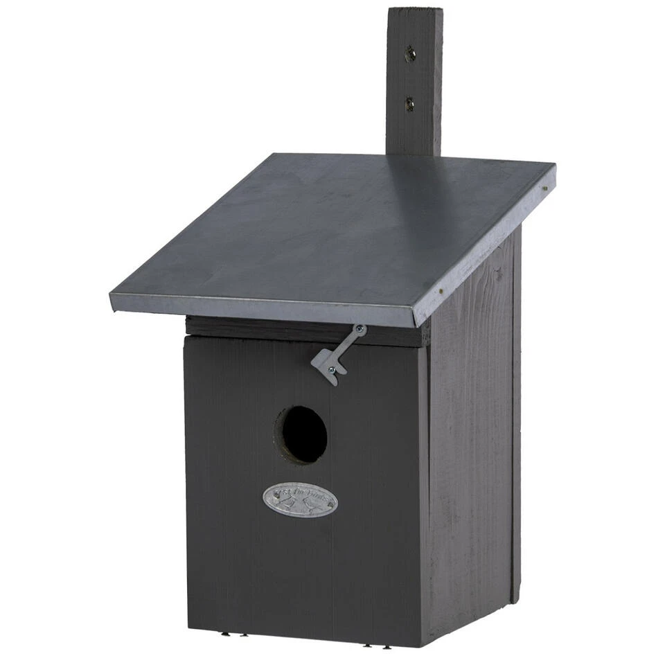 Modern uitgevoerd vogelhuisje afgewerkt met een schuin zinken dakje, het vogelhuisje heeft een grijze kleur.