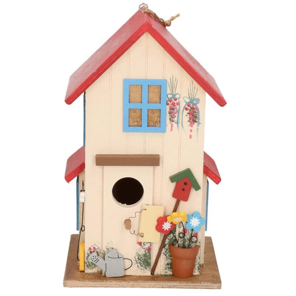 Wit houten vogelhuisje/nestkastje met rood dak gedecoreerd als woonhuis. Het formaat is ongeveer 15 x 13 x 26 cm. Materiaal: multiplex hout. Aan de bovenzijde zit een koord om het vogelhuis mee op te hangen. Bevestigingsmateriaal niet inbegrepen. Een leuk huisje voor kleine vogeltjes zoals: pimpel/koolmeesjes, musjes en andere kleine vogels rondom het huis. Door langdurige blootstelling aan de weersomstandigheden zal het product verkleuren en de verf/opdruk vervagen. Tuindecoratie accessoires vogelhuisje/nestkastje.
