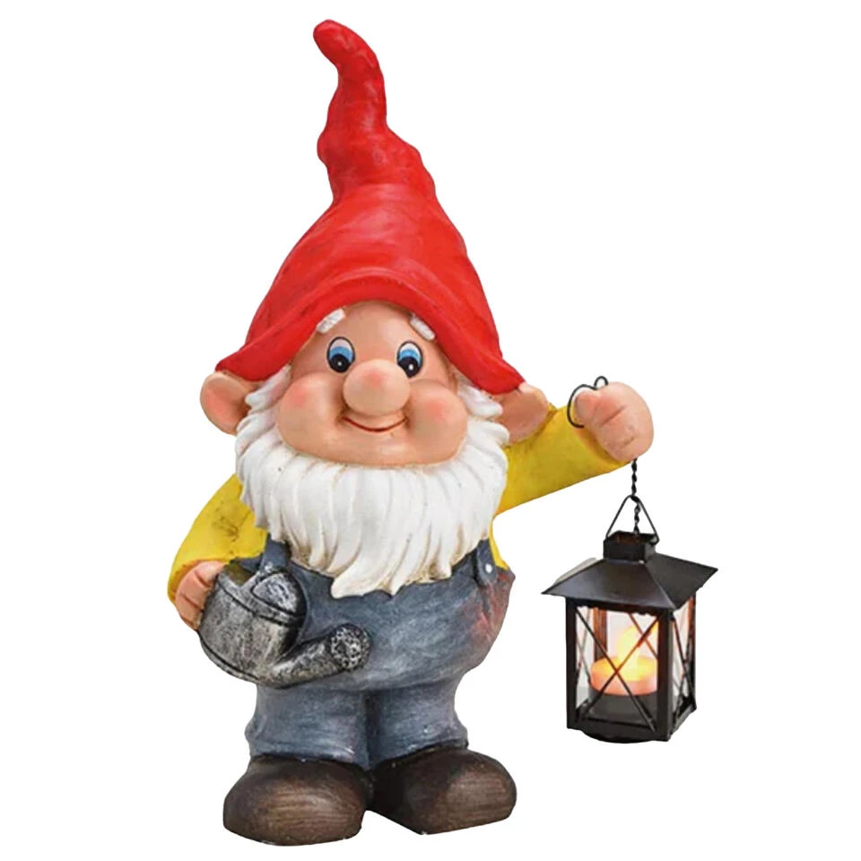 Tuinkabouter met met lantaarn voor een theelichtje. Dit tuinkabouter beeld heeft een formaat van ca. 24 x 15 x 40 cm en is gemaakt van polystone met metaal en glas. Geschikt voor een echt kaarsje! Tuindecoratie/tuinversiering kabouters.