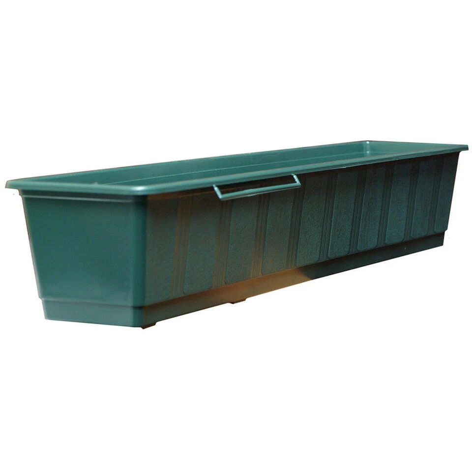 Plantenbak donker groen rechthoekig 80 x 17,5 x 14,5 cm. Materiaal: polypropyleen (plastic/kunststof). Bloembakken/plantenbakken/plantenpotten voor binnen en buiten.