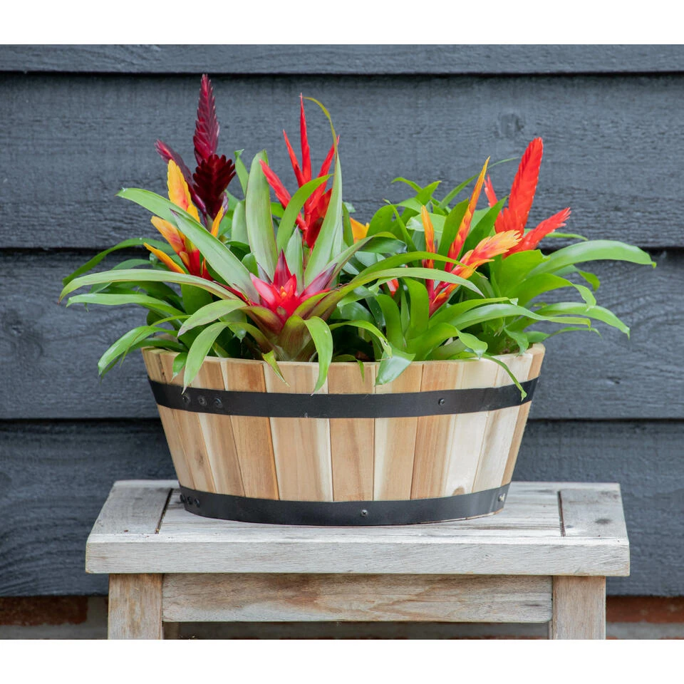 De Plantenbak/bloempot uit de Acacia Barrel Low serie is gemaakt van acacia hout met een zwart metalen rand aan de buitenzijde. Het hout heeft een warme en natuurlijke uitstraling in een naturel bruine kleur. De emmer is zowel binnen als buiten te gebruiken en ideaal als plantenpot/bloempot voor bijvoorbeeld op het terras of in de tuin. Onder in de pot kan een gat gemaakt worden om het water weg te laten lopen. Formaat: Diameter 53 cm x Hoogte 32 cm.