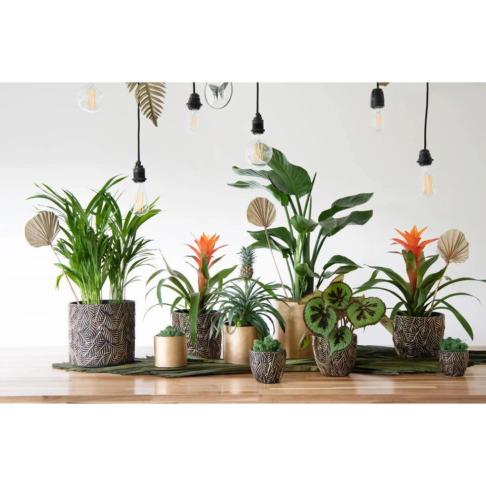 Plantenpot/bloempot gemaakt van keramiek in de kleur antraciet grijs/goud met aan de buitenzijde een bladmotief print. Afmetingen: Diameter 14 cm en Hoogte 13 cm. Vorm: cilinder. Stijlvolle bloempot uit de Adana Cylinder serie voor binnen gebruik is een schitterende toevoeging aan uw interieur.