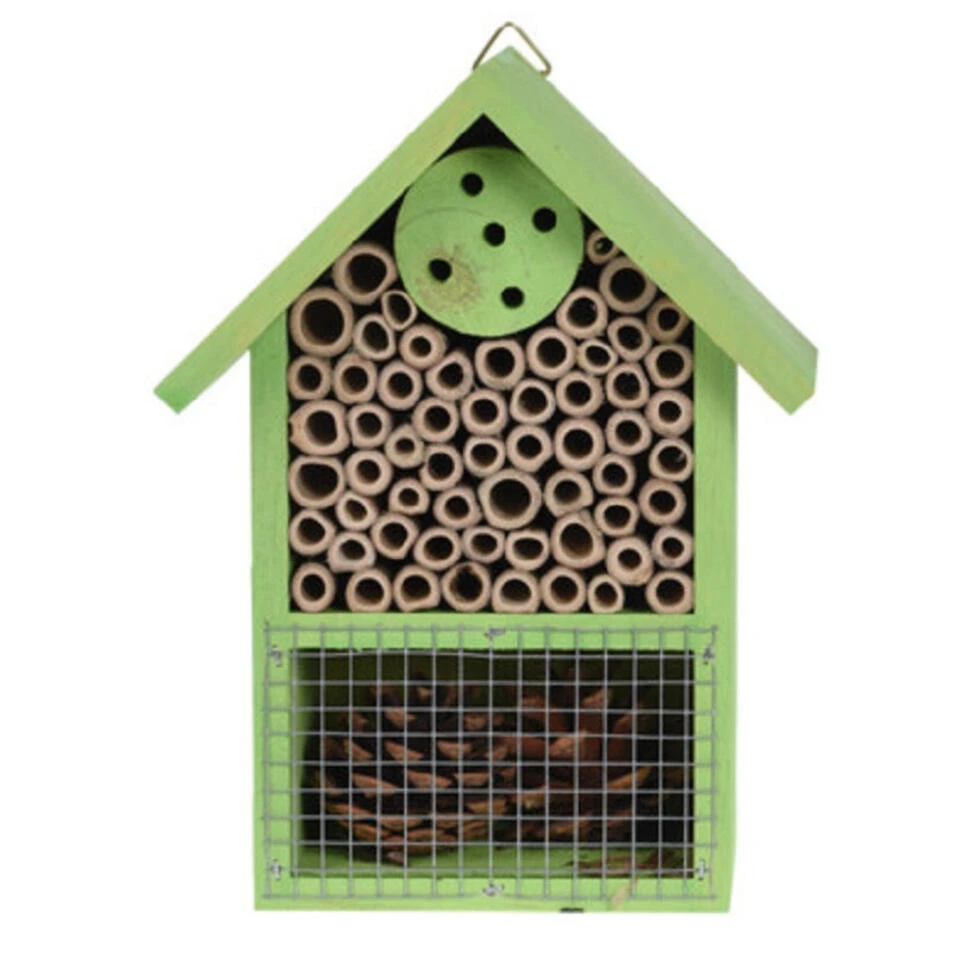 Een groen insecten hotel huisje voor vlinders, lieveheersbeestjes, kevers, duizendpoten, bijen et cetera. In dit insectenhotel kan het ongedierte uitrusten/overwinteren. Afmeting: ca. 15 x 8 x 20 cm. Materiaal: dennenhout. Met ophangoogje. Dit diervriendelijke tuindecoratie accessoires bijenhuis/vlinderhuis insectenhotel draagt bij aan het ecosysteem en de biodiversiteit in uw tuin. Een habitat voor bestuivers en natuurlijke ongediertebestrijders. Een must-have voor tuinliefhebbers/natuurliefhebbers.