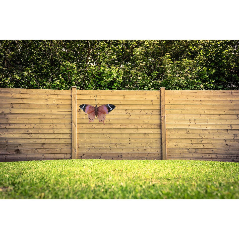 Een roestbruin met roze vlinder, geschikt voor decoratie in uw tuin of aan uw schutting. Met ophangoogje. Afmeting: ca. 35 x 24 cm. Materiaal: metaal. Tuindecoratie muur/schutting ophang vlinders van metaal.