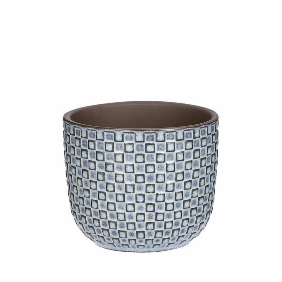 Plantenpot/bloempot van keramiek in de kleur blauw met een mooi patroon. Diameter 11 cm en hoogte 9 cm. Stijlvolle bloempotten voor binnen gebruik met een glanzende finish. Serie: Daan. Het vierkantjes patroon aan de buitenzijde van de pot geeft het geheel een modieus fraai stijlvol uiterlijk. Handgemaakt keramiek.