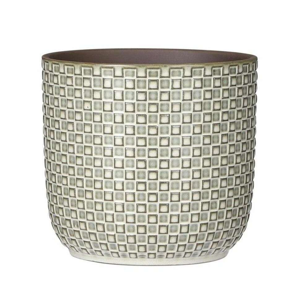 Plantenpot/bloempot van keramiek in de kleur wit met een mooi patroon. Diameter 17 cm en hoogte 16 cm. Stijlvolle bloempotten voor binnen gebruik met een glanzende finish. Serie: Daan. Het vierkantjes patroon aan de buitenzijde van de pot geeft het geheel een modieus fraai stijlvol uiterlijk. Handgemaakt keramiek.