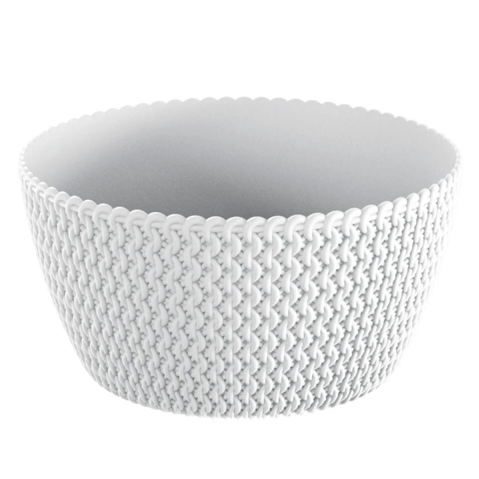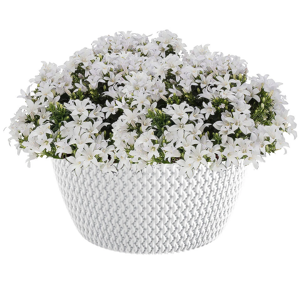 Tafelstuk plantenpot/bloempot van kunststof met diameter 24 cm en hoogte 12 cm in het parel wit. Geschikt voor buiten en binnen. Vorstbestendig ja. Basic plantenpotten voor op tafel in de tuin en/of binnen.