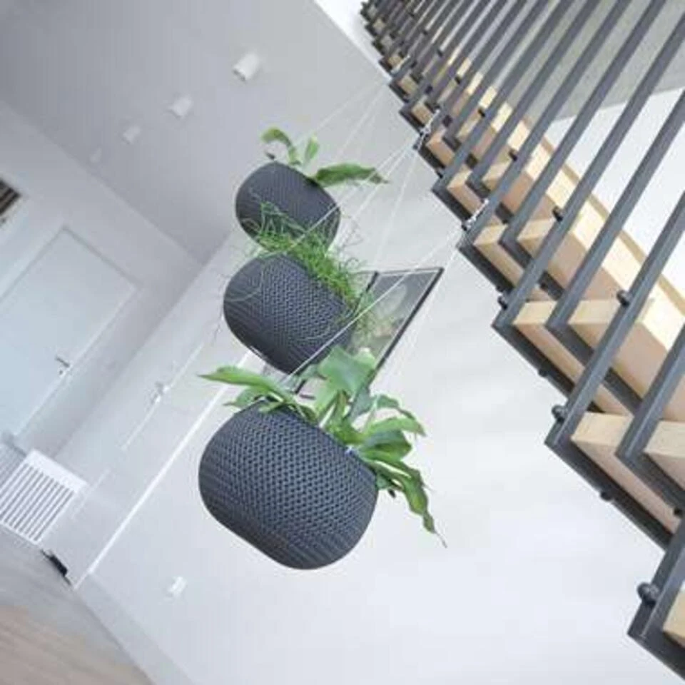 Antraciet kunststof hangende Splofy bloempotten/plantenpotten 24 cm inclusief metalen haak. Kras en stootvaste ophang bloempotten/plantenbakken met de uitstraling van zachte, grof gebreide wol. De hangende bloempotten/plantenpotten zijn uitgerust met een binnenbak en een metalen haak. De ophangpotten zijn geschikt voor binnen en buiten gebruik. Serie: Splofy round ws. Formaat: diameter: ca 23,9 cm. Hoogte: ca 16,1 cm. Inhoud: 2,3 liter. Materiaal: kunststof. Tuin/huisdecoratie hang bloempot/plantenbak.
