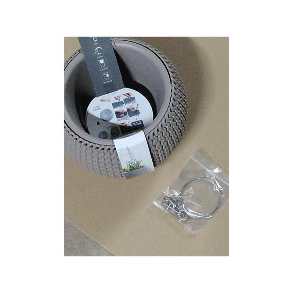 Taupe kunststof hangende Splofy bloempotten/plantenpotten 24 cm inclusief metalen haak. Kras en stootvaste ophang bloempotten/plantenbakken met de uitstraling van zachte, grof gebreide wol. De hangende bloempotten/plantenpotten zijn uitgerust met een binnenbak en een metalen haak. De ophangpotten zijn geschikt voor binnen en buiten gebruik. Serie: Splofy round ws. Formaat: diameter: ca 23,9 cm. Hoogte: ca 16,1 cm. Inhoud: 2,3 liter. Materiaal: kunststof. Tuin/huisdecoratie hang bloempot/plantenbak.