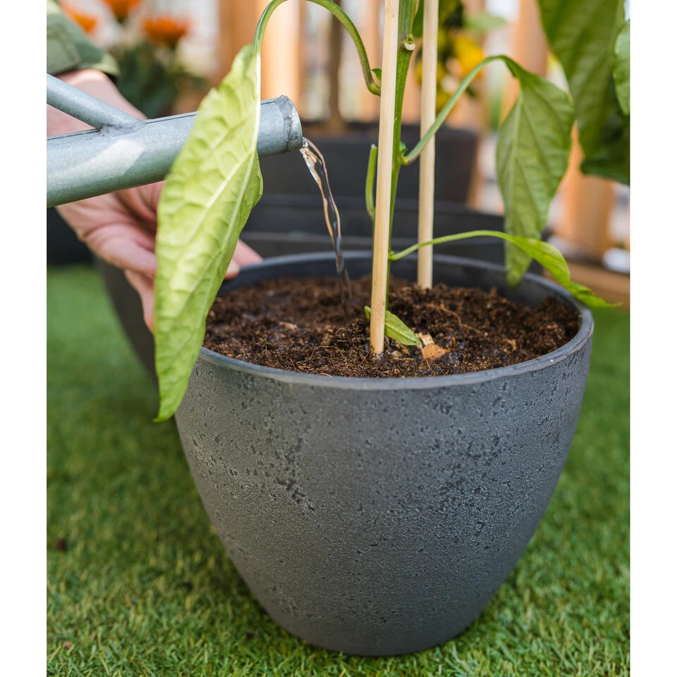 Bloempot/plantenpot voor buiten en binnen gebruik, gemaakt van van gerecycled kunststof en steenpoeder in de kleur antraciet met diameter 43 cm en hoogte 33 cm. Bloempotten voor kamerplanten, buitenplanten of kunstplanten. Deze plantenpot voor binnen en buiten heeft een stijlvolle uitstraling in elk interieur. Een unieke duurzame mix van materialen dat nu geen afval is, maar een prachtige duurzame bloempot. Een sterke, mooie pot die vriendelijk is voor het milieu en de portemonnee. De pot heeft gaatjes in de onderkant dus een opvangschaal is voor binnen gebruik vereist. Serienaam: Nova. Deze serie potten hebben een eigen drainagesysteem onderin de pot en zijn vorstbestendig.