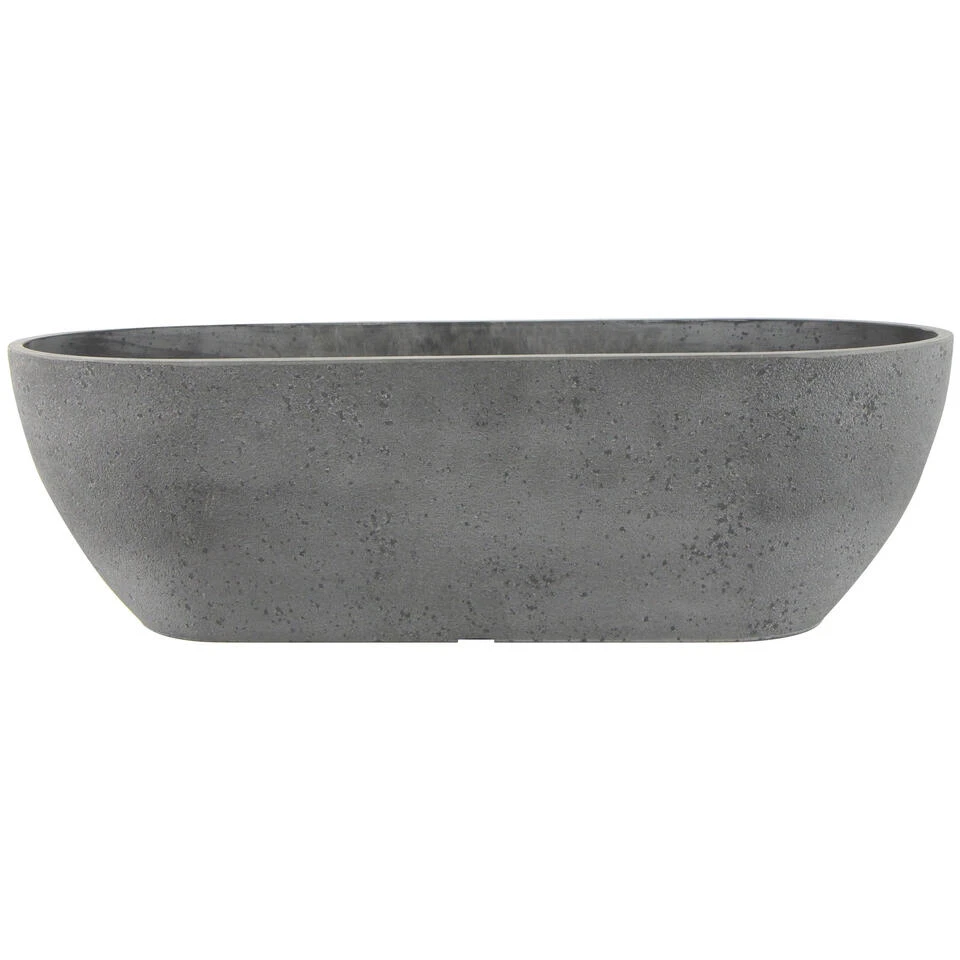 Bloempot/plantenpot balkonbak van gerecycled kunststof en steenpoeder in de kleur donkergrijs met diameter 55 x 16 cm en hoogte 16 cm. Potten voor buitenplanten of kunstplanten. Deze plantenpot voor buiten heeft een stijlvolle uitstraling. Een unieke duurzame mix van materialen dat nu geen afval is, maar een prachtige duurzame bloempot. Een sterke, mooie pot die vriendelijk is voor het milieu en de portemonnee. De pot heeft gaatjes in de onderkant dus een opvangbalkonbak is voor binnen gebruik vereist. Zoeknaam serie voor de balkonbak is Nova concrete donkergrijs. Deze serie potten hebben een eigen drainagesysteem onderin de pot.